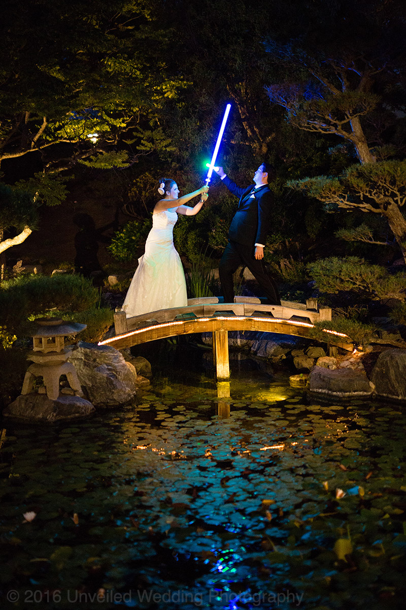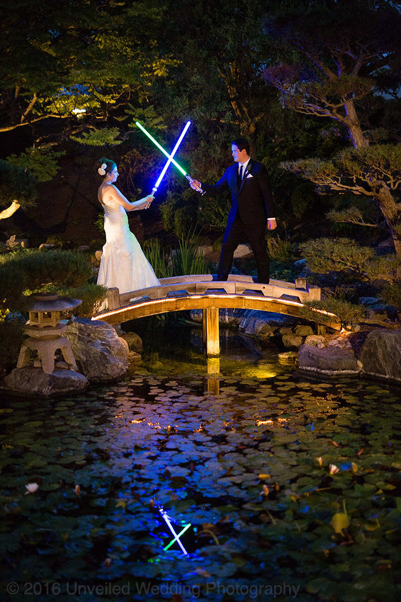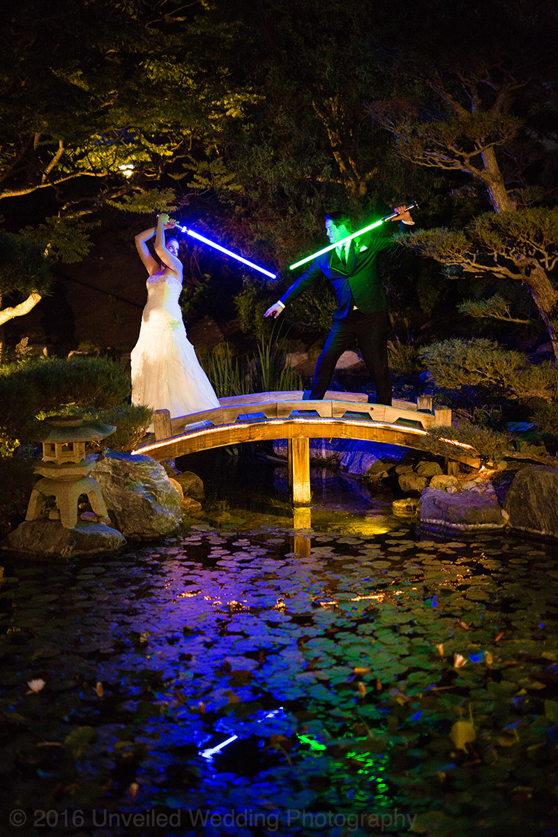 ▼他們也不同顏色的光劍,在夜裡拍出互相切磋的婚紗照,完全就是別樹一格的味道!
