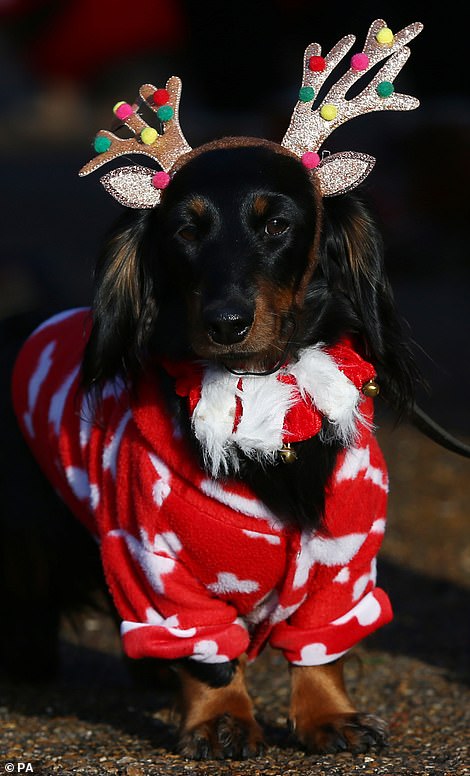 ▼短腿臘腸狗盛裝出席,穿上聖誕服裝,戴上精靈帽子,簡直可愛到不行。