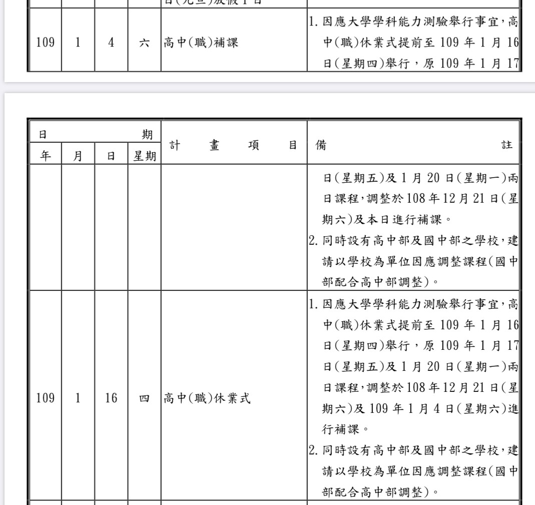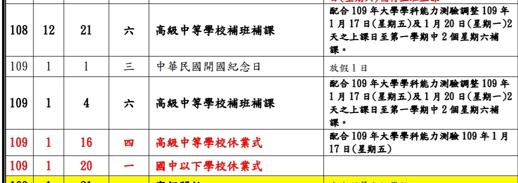 2019年12月20日高中職休業式提前至109年1月16日舉行!109學年度大學學科能力測驗將於明年1月17日、18日2天舉行,為此高中職休業式將提前,原本安排1月17日及1月20日兩日課程,將調整到本周六(21日)及明年1月4日補課。