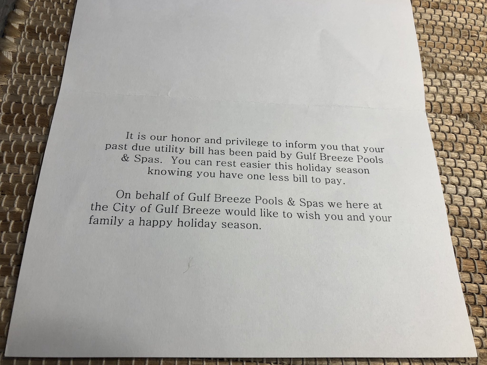 ▼卡片中寫了:「我們很榮幸的通知您,您所積欠的雜費帳單已經由 Gulf Breeze Pools & Spas 支付。您可以因為少了一項支出而以更輕鬆的心情來過節。在此僅代表 Gulf Breeze Pools & Spas 祝福您和家人節日快樂!」
