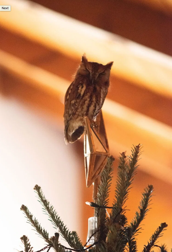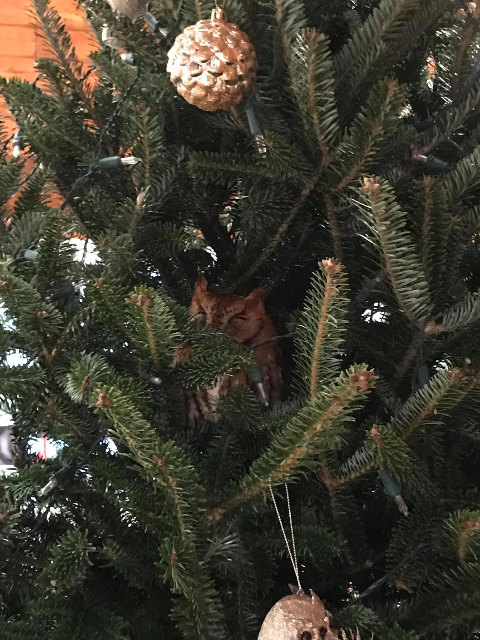 自來貓頭鷹躲聖誕樹「睡搞搞」 小女孩被嚇到大叫媽媽:牠轉頭盯著我看