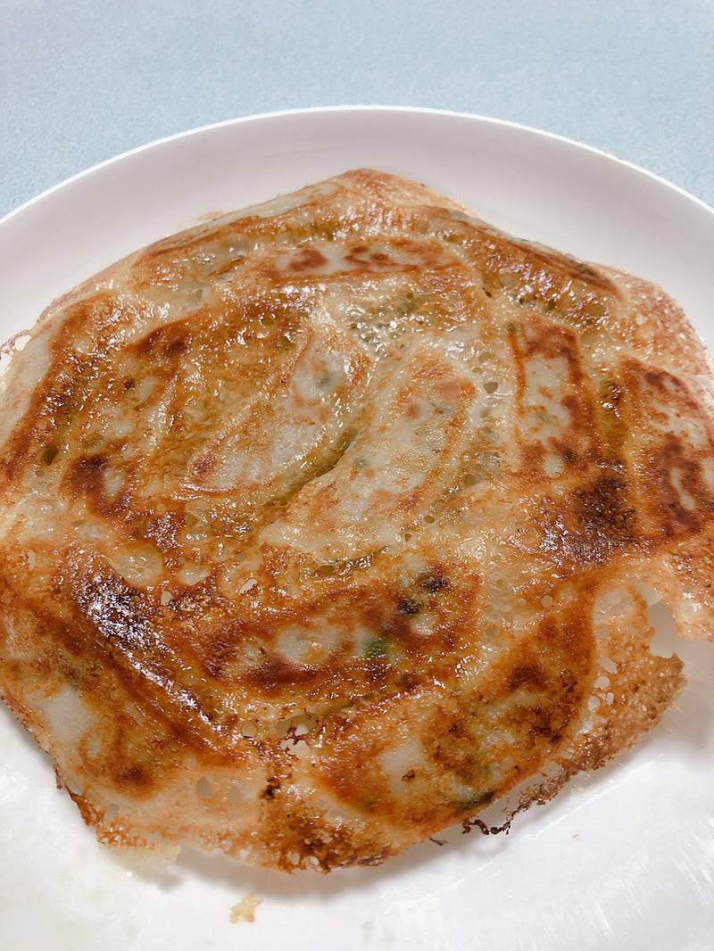 ▼最後在餡料的上方覆蓋另外一層餃子皮,這樣就可以開火慢慢煎熟了!