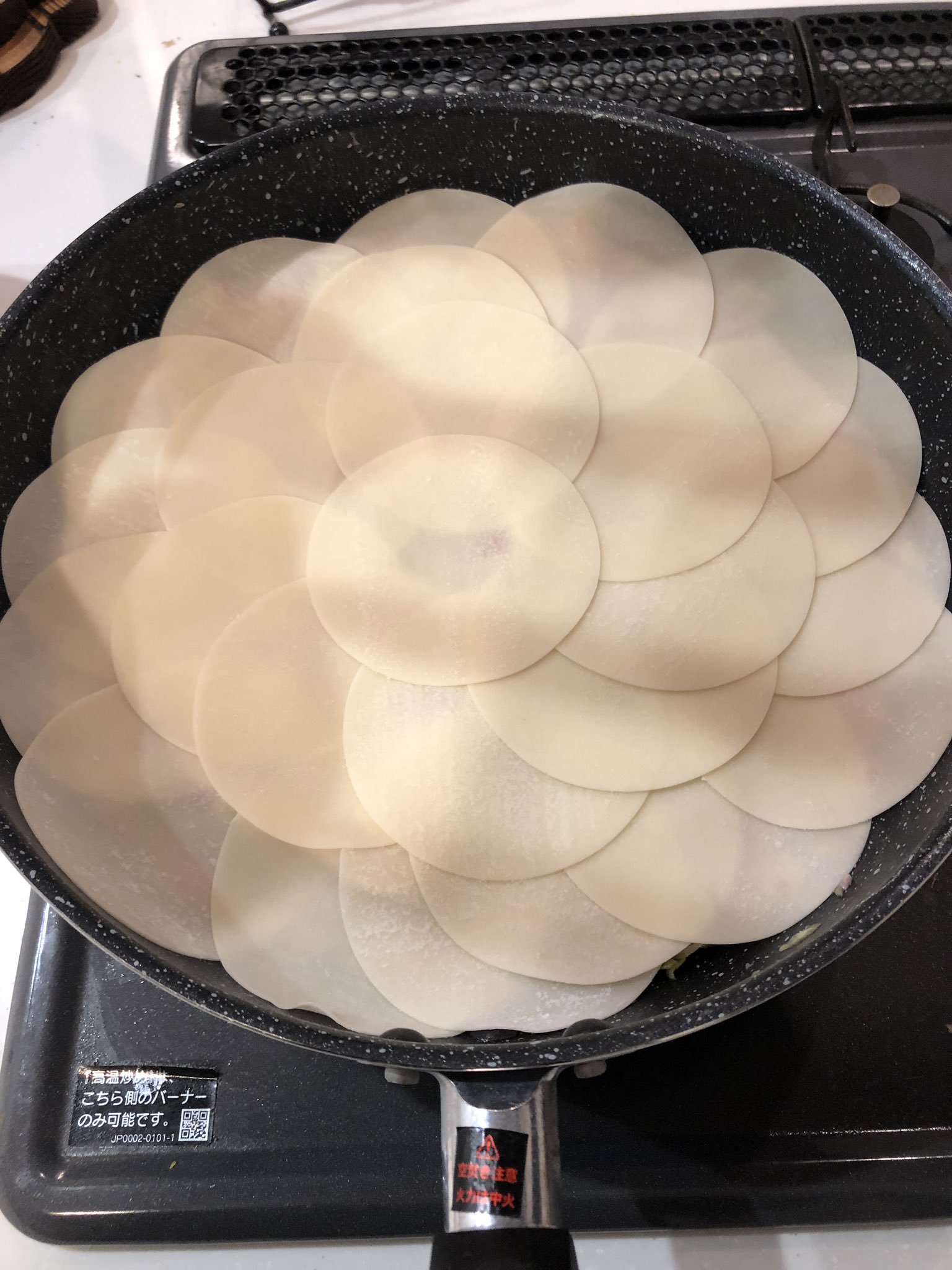 ▼日本網友胡桃(@silver_egg_77)不久前就在推特上分享了自己的「懶人煎餃做法」,引起了許多網友的關注和討論!原來他表示因為天氣實在太冷,根本沒有多餘的心力來包餃子,於是想出了這個超簡易的方式!首先就跟下圖一樣,在平底鍋上鋪滿適量的餃子皮!
