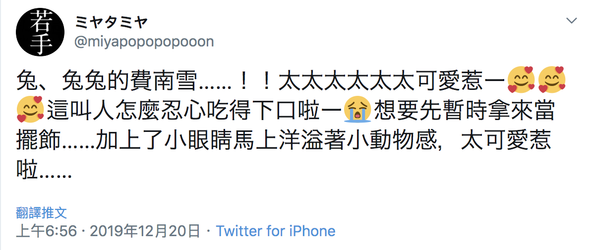 2019年12月23日甜點能消除疲勞、兔兔也能撫慰人心,那麼兔兔造型的甜點肯定能帶來雙倍的療癒~沖繩這家甜點店就推出了兔兔造型的費南雪(金磚蛋糕),圓圓的身材+小眼睛大耳朵超可愛,讓櫻花妹們不禁大叫:「捨不得吃啦~」