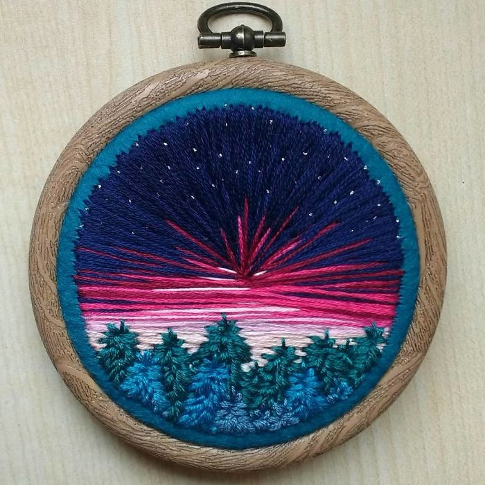 鬱鬱蔥蔥的樹叢、星光璀璨的夜色…這些如夢似幻的景色都被Victoria用刺繡的形式紀錄了下來。她的作品讓人看得心情舒暢,有一種超紓壓的感覺啊~