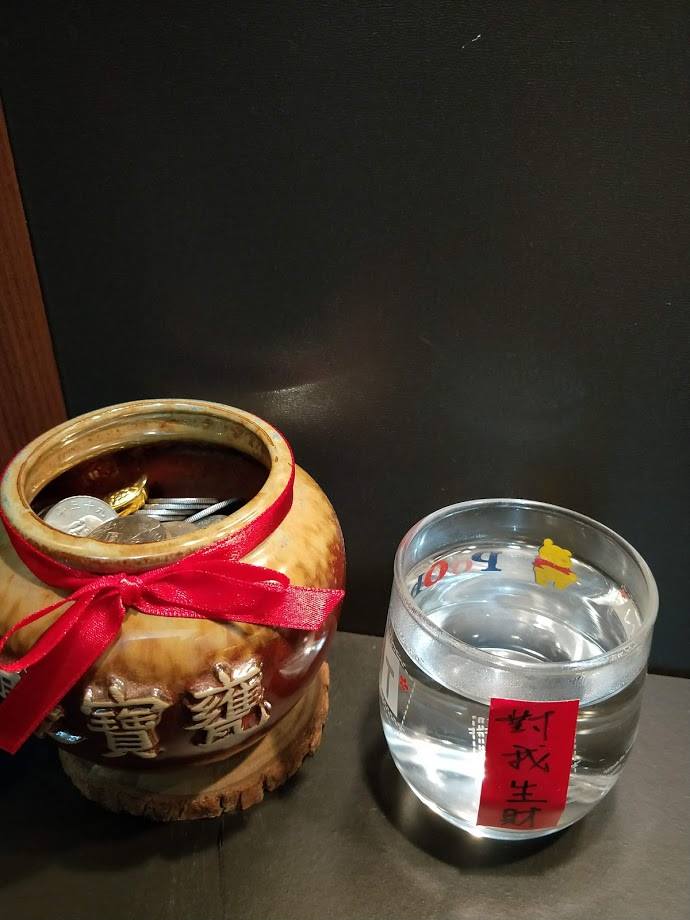3.水冷卻後把銅板撿起來,擦乾後放在聚寶盆財位;冷卻的水裝到杯子裡蓋上蓋子,上面用紅紙寫「對我生財」,然後放到財位上。