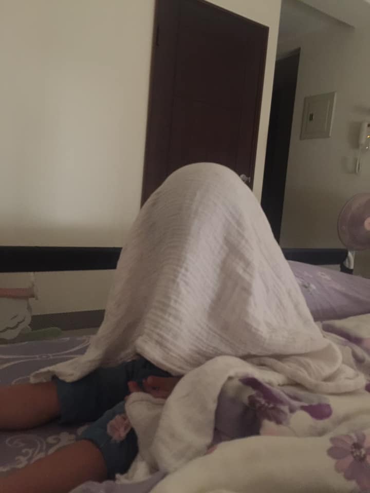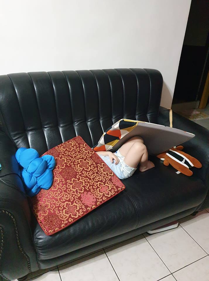 ▼只見小孩躲在櫃子下面,或被子、毯子裡,明明腳都露出來了,卻還躲得很認真,讓媽媽忍不住嘴角上揚。
