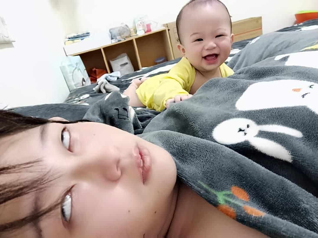 ▼這位媽媽躺在床上累到翻白眼,旁邊的寶寶卻精力十足,臉上帶著甜笑,還準備爬到媽媽身上,讓媽媽陪自己玩。