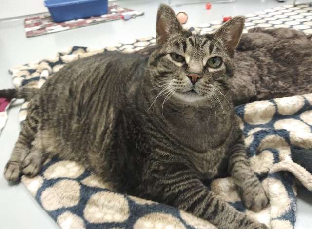 ▼Zack是密西根州動保協會的一隻待領養貓咪。牠已經12歲了,體重足足有13.6公斤。