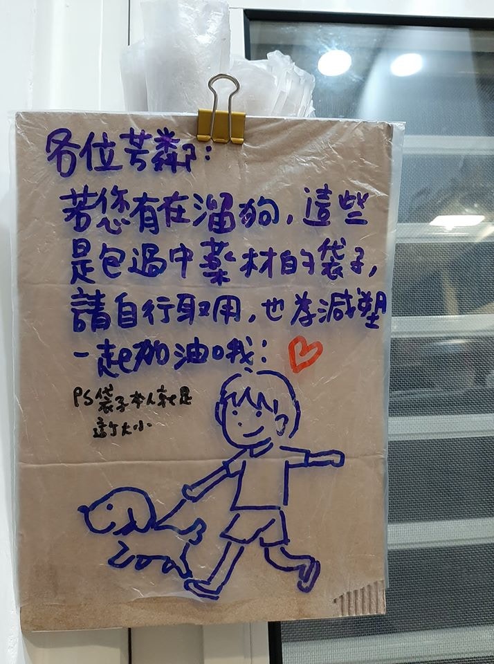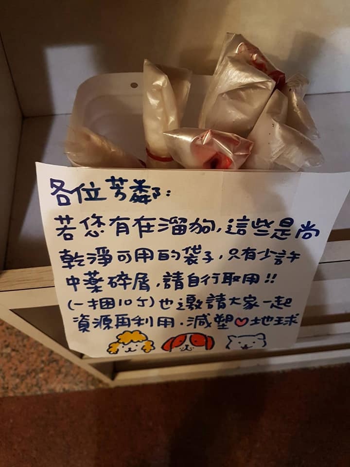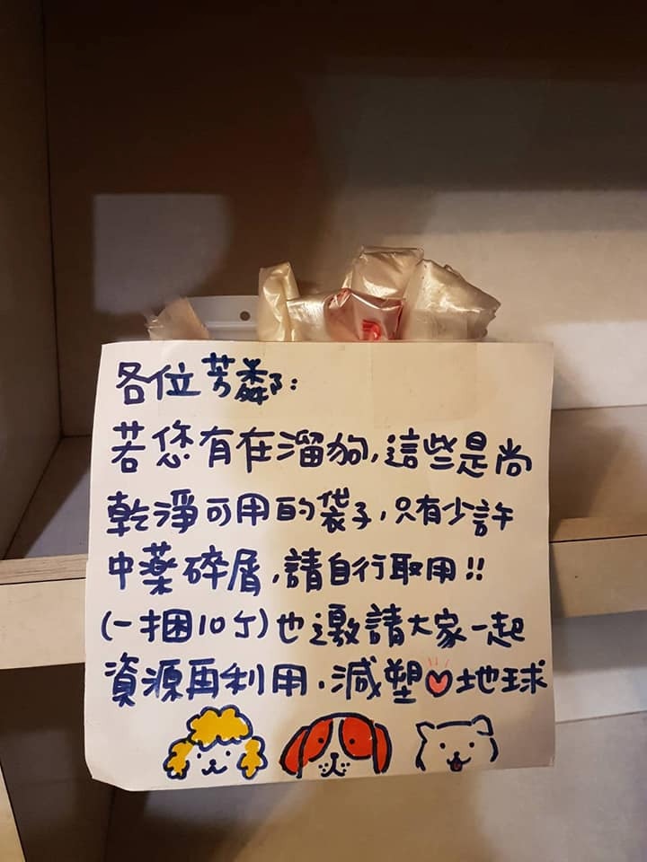 ▼​女網友貼心留下字條,說:「若您有在遛狗,這些是尚乾淨可用的袋子,只有少許中藥碎屑,請自行取用!也邀請大家一起資源再利用,減塑愛地球。」