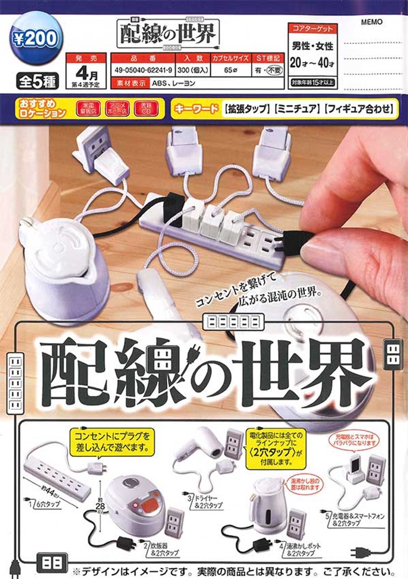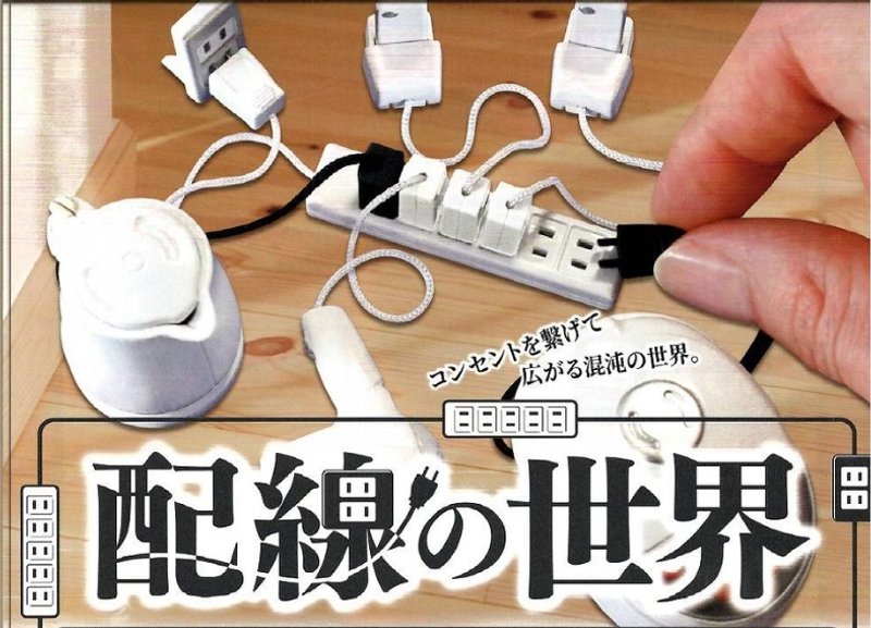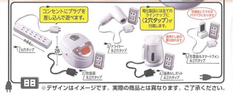 ▼這次EPOCH推出的「電線扭蛋」(配線の世界)以常見的插座為主題,非常生活化。這一系列扭蛋共有5種樣式,分別為六孔延長線(六穴タップ)、電鍋和兩孔插座(炊飯器 & 2穴タップ)、吹風機和兩孔插座(ドライヤー&2穴タップ)、熱水壺和兩孔插座(湯沸かしポット& 2穴タップ)、手機充電座和兩孔插座(充電器&スマートフォン &2穴タップ)。