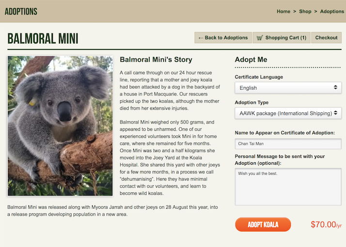 「international shipping」要支付70澳元,跟「Adopt A Wild Koala Package」一樣,也會收到實體的助養證書等等。
