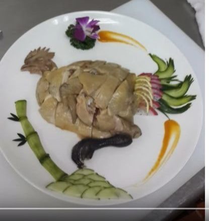 ▼一位大廚將白切雞擺成了一隻馬奔馳的模樣,看起來很有氣勢。這簡直是藝術品,誰捨得吃掉啊?!