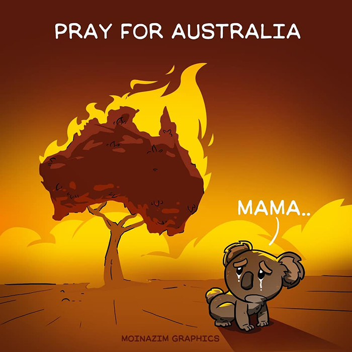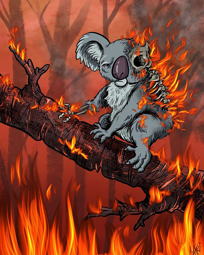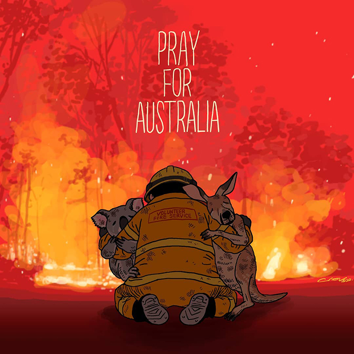 2020年01月14日從2019年9月開始,澳洲各地開始出現森林大火。高溫、乾旱和強風,導致野火延燒4個月,無數人、動物受到影響。現在全世界的目光都聚集在澳洲,藝術家們也拿起畫筆,以此為主題創作了很多令人動容的作品。快來看看吧。