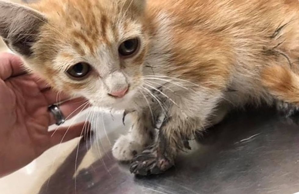 ▼小貓貼著玻璃使勁磨蹭,還不時發出喵喵的叫聲,好想在求助。Justin連忙將牠帶進來,這才看到牠的腳上沾滿油漆。外面氣溫很高,這隻可憐的小貓不知道在烈日下曬了多久,身體很燙。