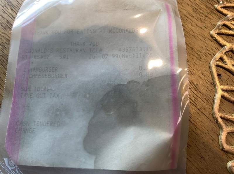 ▼1999年7月7日,David從猶他州洛根(Logan)的麥當勞買了一個漢堡。當時他本準備買一些漢堡展示食物變質的過程,但這個不是拿來展示的,而是買來放進口袋忘記了。