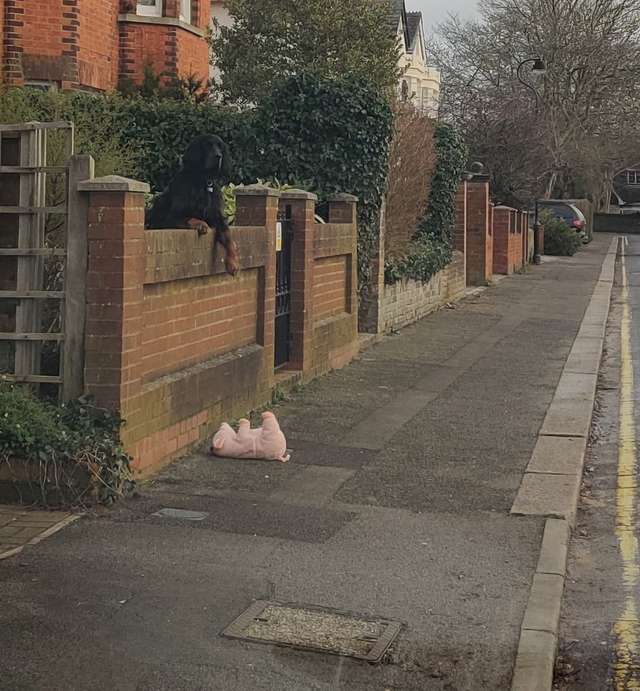 ▼Claire馬上掉頭,撿起小豬玩偶還給了狗狗。她將照片分享到臉書社團,引起了很多人的關注,大家都覺得狗狗很可愛。Claire表示,那隻狗狗體型很大,完全可以跳過矮牆,但主人應該教過牠,不能隨便出來,所以牠乖乖待在那裡等人幫忙,也不知道等了多久。