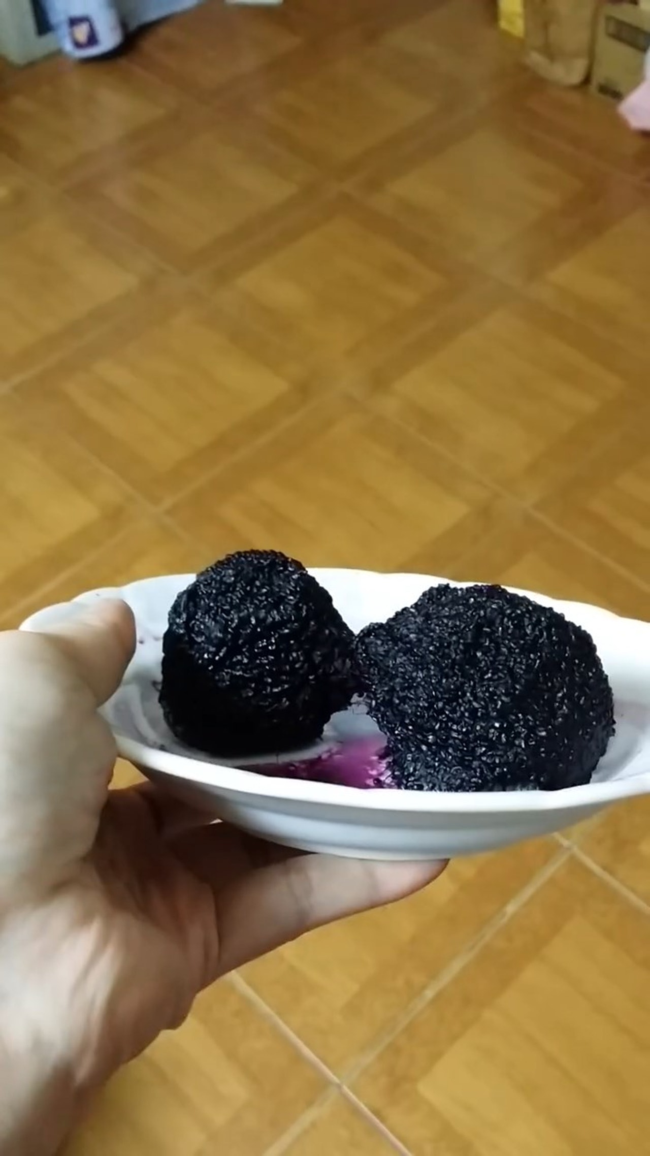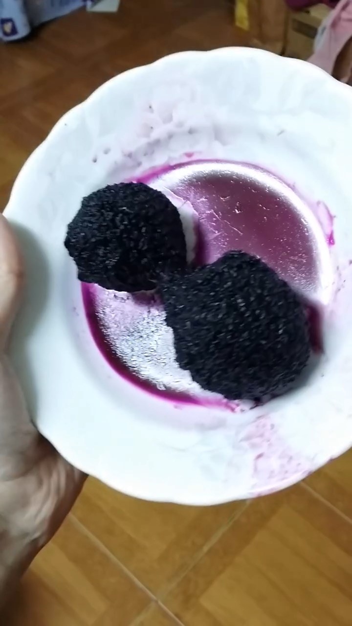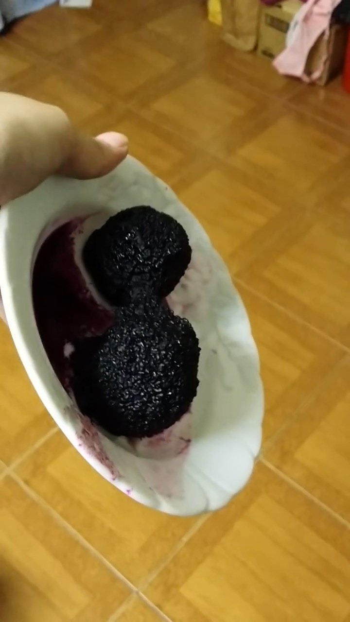 ▼這兩顆黑色的丸子看起來像桑椹,但足足有高爾夫球那麼大,碟子裡還有已經凝固的深紫色液體。因為放了太久,不管原po怎麼搖晃碟子,丸子都絲毫不動,緊緊黏在碟子上。