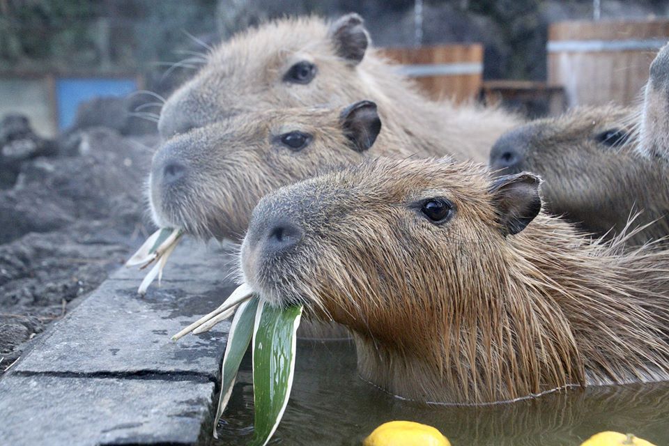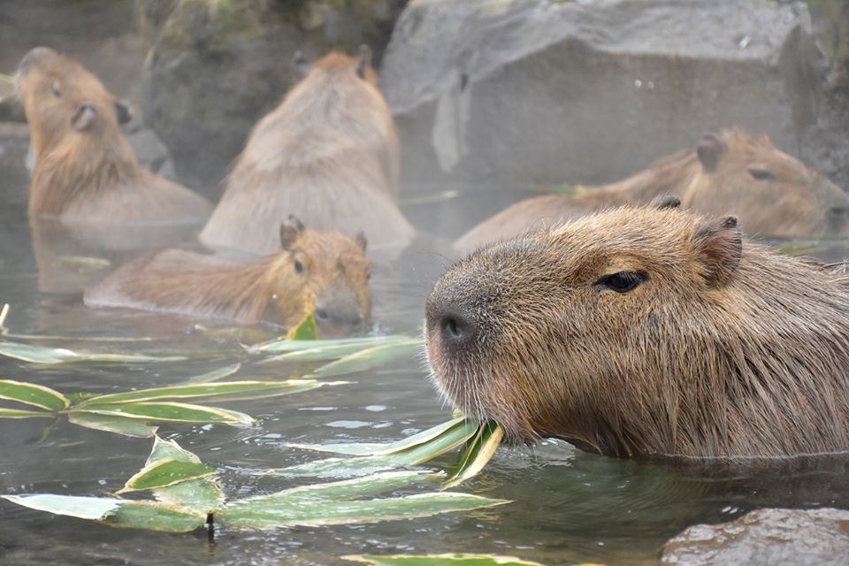▼水豚泡在溫泉中享受的模樣,成為了這間公園人氣最高的景點。飼育員還會在溫泉湯中「加料」,有時是柚子,有時是蘋果,還有柑橘,讓水豚盡情享受。這一活動會進行到2020年4月5日。