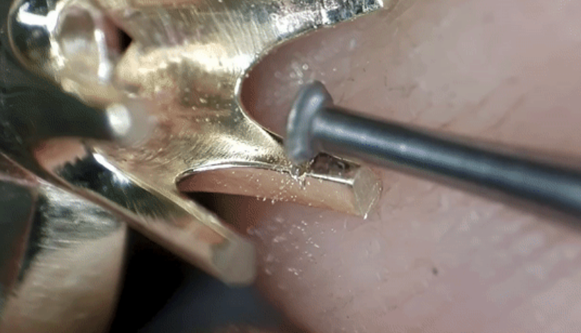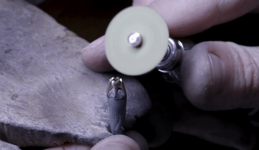 ▼4.製作鑽托造型 :用鋸子磨出鋸齒形狀。Pablo做的是最常見的六爪鑲嵌,6個爪子固定住鑽石,非常牢固;