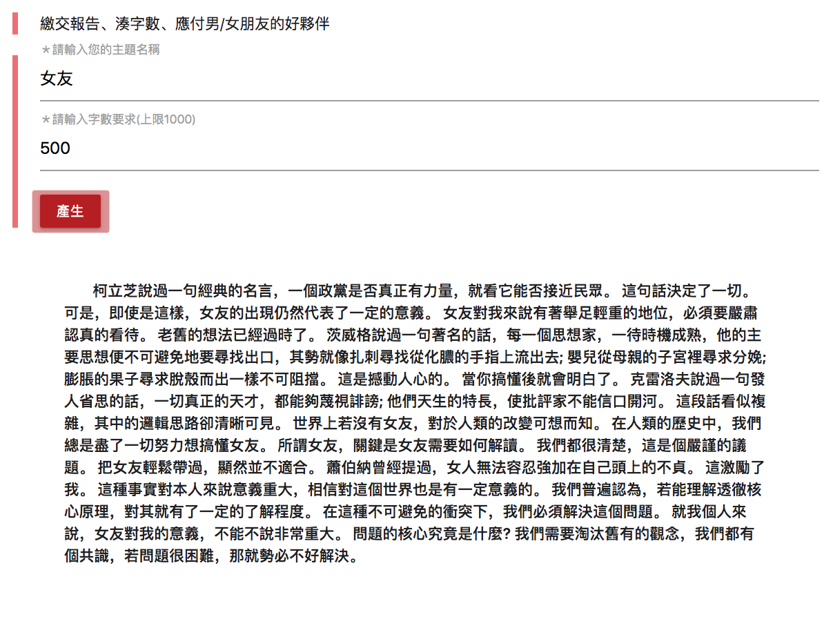 這個工具其實對寫不出長文的人可能會有點幫助,只要多看就會知道寫長文的訣竅(有嗎?)。至於拿去交報告的部分,請大家要三思而後行啊!(笑
