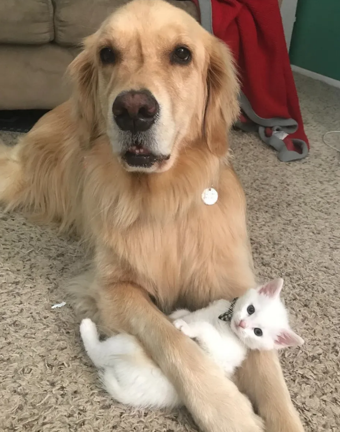 2020年01月29日外國女子 Kim Downie 的丈夫在動物醫院工作,當她的丈夫發現一隻3個月大的小白貓被留在醫院時,很快就決定要帶牠回家!一開始還有點擔心家裡的黃金 Mojito 會不會接受小白貓,但是幾天後他們就看見小白貓和 Mojito 相處得就像是家人一樣了!