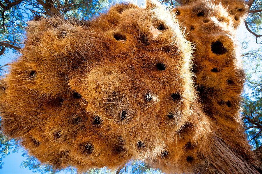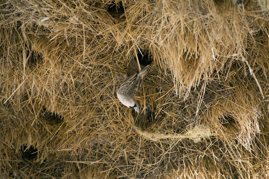 ▼群織雀是群居型動物,會跟同伴合作築巢。這些大草團裡有很多小房間。小一些的鳥巢能住幾十隻鳥,大一些的能容納上百隻,好幾代群織雀都住在裡面。每個房間都有單獨的出入口,就像一棟集合式公寓一樣。