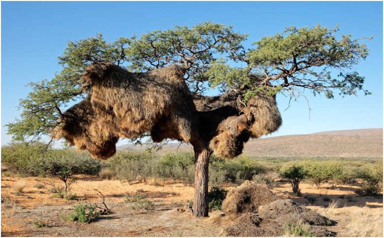 ▼如果家族中有了新成員,群織雀會在原本的巢外擴建巢穴,所以鳥巢會越來越大。目前人們發現的最大的群織雀巢長6公尺、寬4公尺、高2公尺,能夠住500多隻鳥,重量足足有907公斤!