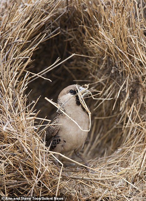 ▼原來這些草團是巨大的鳥巢!建造這些鳥巢的是群織雀(Sociable Weaver),牠們主要在農田附近的草叢裡活動,吃灌木的種子或果實,體長14公分左右。