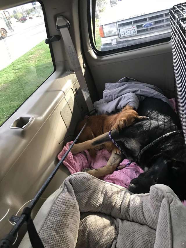 ▼Murphy跟著好友上車,確定這些人會幫忙後才放鬆下來。牠將頭靠在Marley的肚子上,似乎在用自己的方式告訴牠:「不用怕,我會陪著你。」Faith將狗狗帶到獸醫院,檢查後發現Marley骨折,肚子裡還有11隻小狗。牠接受治療期間,Murphy全程陪伴在牠旁邊。