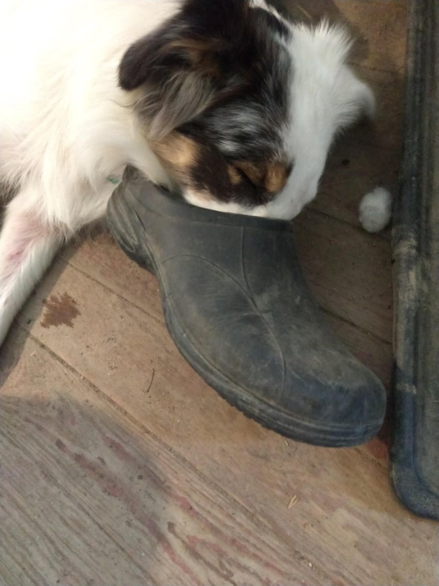 ▼於是主人們常常看到狗狗不僅不討厭自己的「臭鞋子」,反而把整個嘴巴塞進去。
