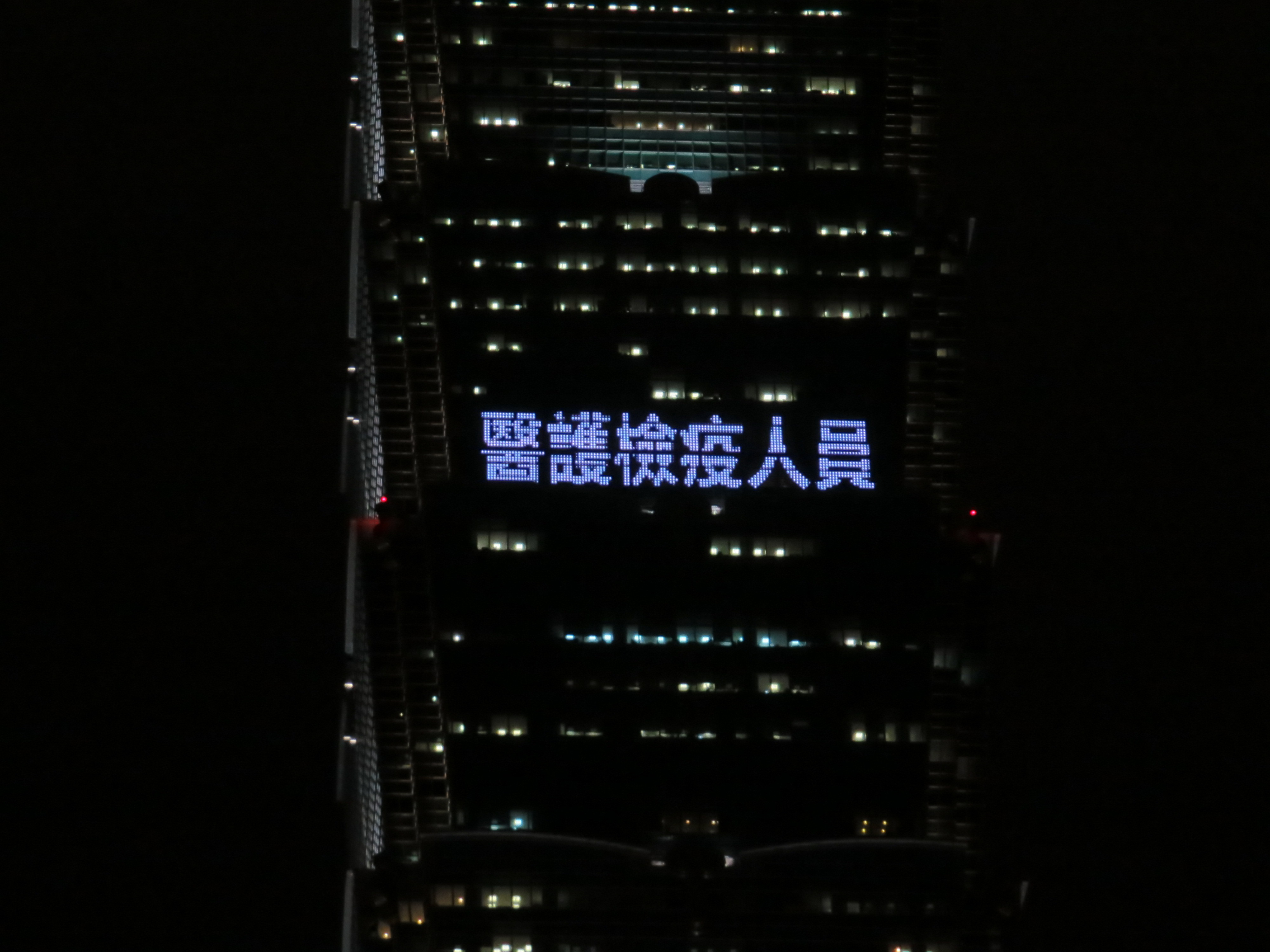 2020年02月06日武漢肺炎疫情沒有緩解下來的跡象,世界各國都開始嚴防。台灣早在世界各國察覺疫情會擴散前,已經第一時間啟動防疫機制,第一線與後端防疫人員都嚴守國門。為了感謝這些防疫人員的辛勞,台北101決定點燈送暖!