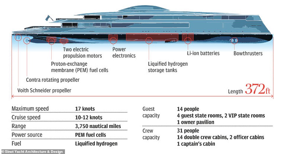 ▼這艘超豪華的遊艇擁有2個28噸容量的真空密閉能源箱,裡面裝有被控制在零下253度的液態氫。
