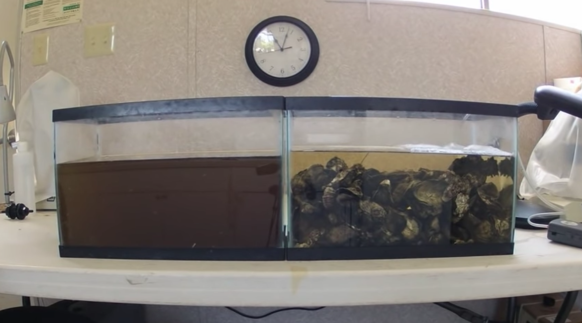 ▼美國環保組織發布的影片表明,將兩個相同的箱子裡面裝滿相同的髒水,唯一不同的是,有一個箱子裡面裝滿牡蠣。大約兩個小時後,我們可以在影片中看到,有牡蠣的水變得很清澈。