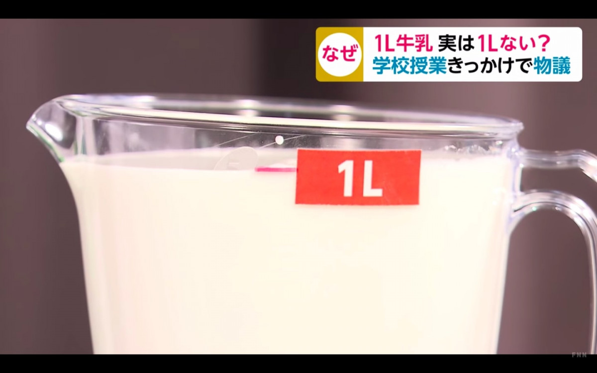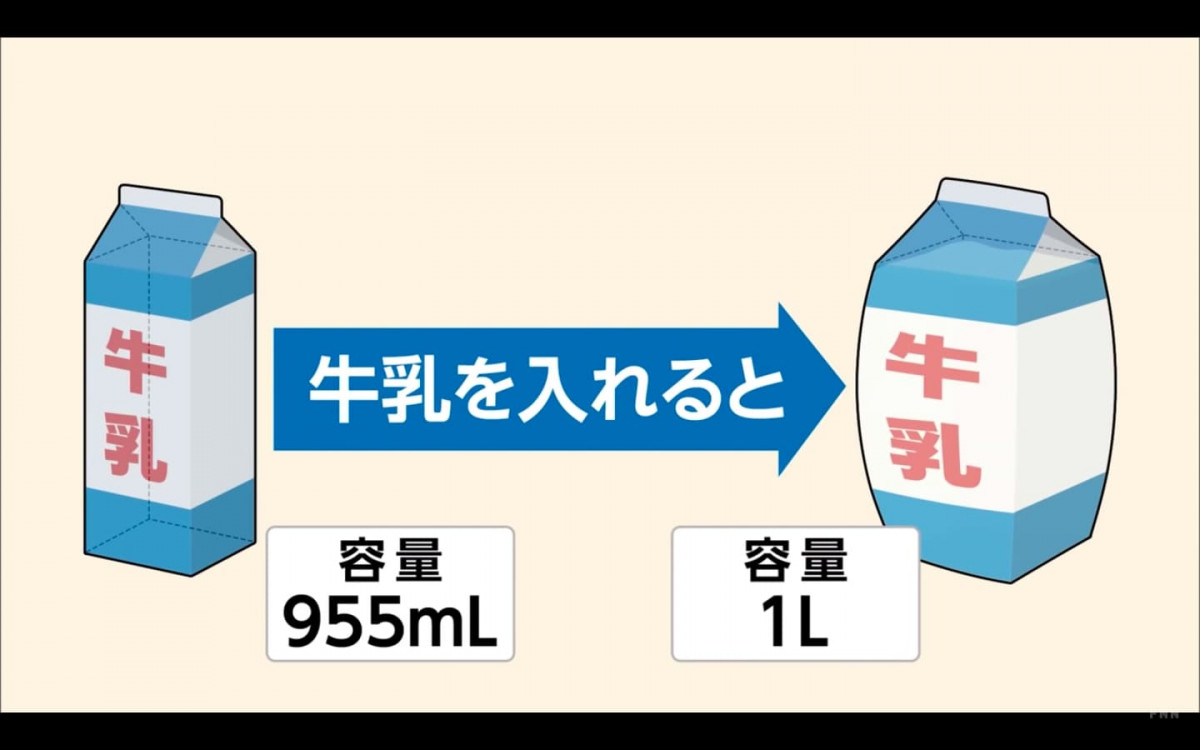 ▼這個問題不僅讓學生們百思不得其解,還引發網友討論。就連Yahoo! News和電視台也通過節目驗證「牛奶盒容量之謎」。富士電視台的「Live News it!」首先根據牛奶盒的尺寸,得出955ML容量的結果,這跟前田健太老師的結論一樣。也就是說,常規的牛奶盒是不能容納1L牛奶的。