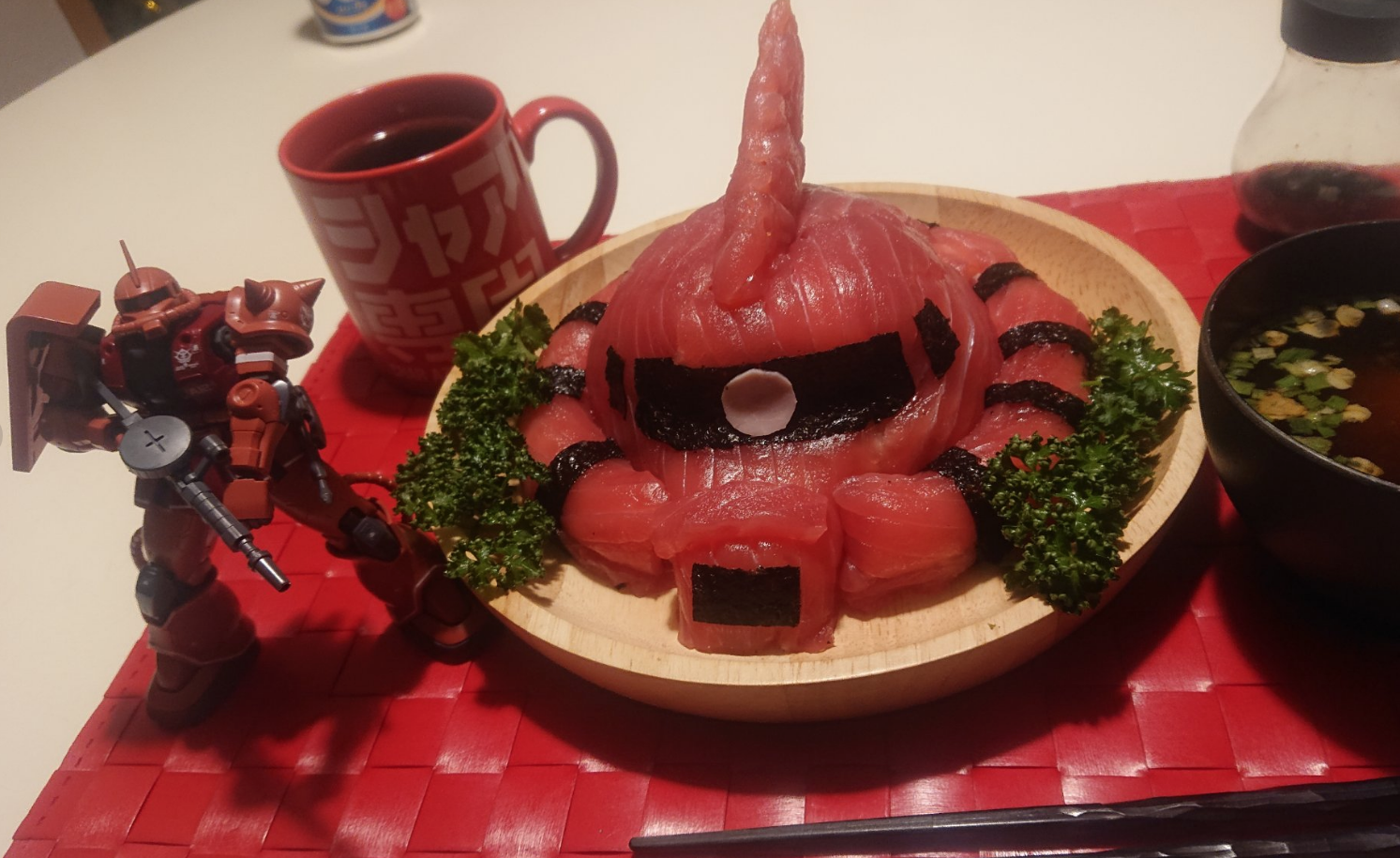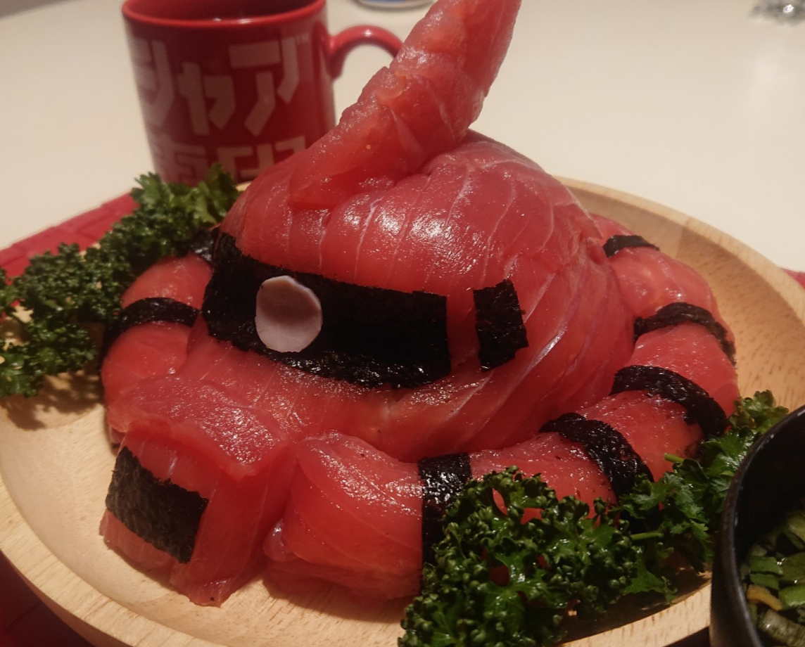 ▼除此之外,紅色彗星「夏亞阿茲納布爾」也完美地做出來~這個鮪魚壽司光賣相就感覺很好吃!