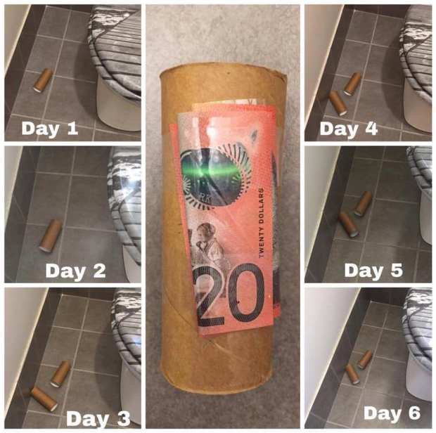 ▼這位媽媽在用完的衛生紙捲上貼20澳幣(約台幣405元),還在一張紙屑上貼5澳元(約台幣100元),並在旁邊寫:「誰看到就是誰的。」她將衛生紙捲擺在馬桶旁邊,家人一定能夠看到。接下來的6天裡,她每天都在臉書上分享垃圾的狀態。