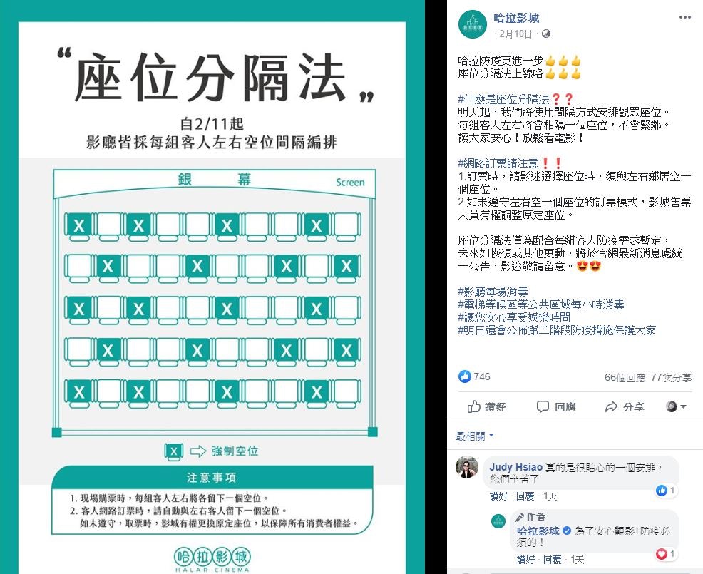 ▼哈拉影城在臉書貼出公告:「自11月11日起,影院內採取『座位分隔法』,每組客人左右相隔一個客人,使用網絡購票的客人也需符合該項規定。若未遵守該項規定,影城售票人員有權調整原定座位。請大家安心放鬆看電影。」