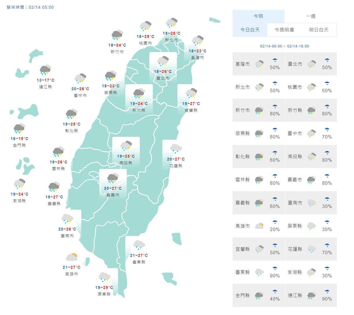 情人節全台有雨,直到周日雨勢才會稍緩,但是周日又會遇上強冷空氣。必須出門的人請多注意瞬間大雨和強陣風,也要記得帶上雨傘啊!