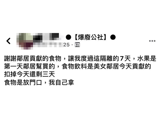 ▼原po表示,自己正在被隔離,幸好鄰居們幫忙將食物放在門口,她才能度過這段日子。「謝謝鄰居貢獻的食物,讓我度過這7天。水果是第一天鄰居幫買的,食物飲料是美女鄰居今天貢獻的,扣掉今天還剩三天。」