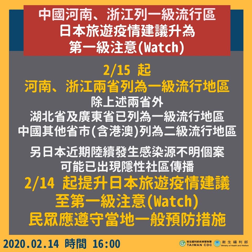 2020年02月15日新冠肺炎(COVID-19)又名武漢肺炎疫情不斷擴散,各國都陸續傳出確診案例,其中台灣人最常去旅遊的日本,也在近日連連增加確診。中央流行疫情指揮中心就宣告,日本目前已列為旅遊一級警示區。