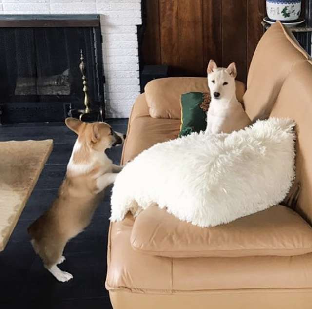 ▼Serena家的柯基犬叫Tonic,牠很想跳到沙發上,但屢試屢敗。爸爸媽媽很寵愛牠,每次看到牠想往上爬,就會把牠抱上去。家中的另一隻狗狗Gin是大長腿,能輕鬆跳到沙發上,跟Tonic的對比非常明顯。