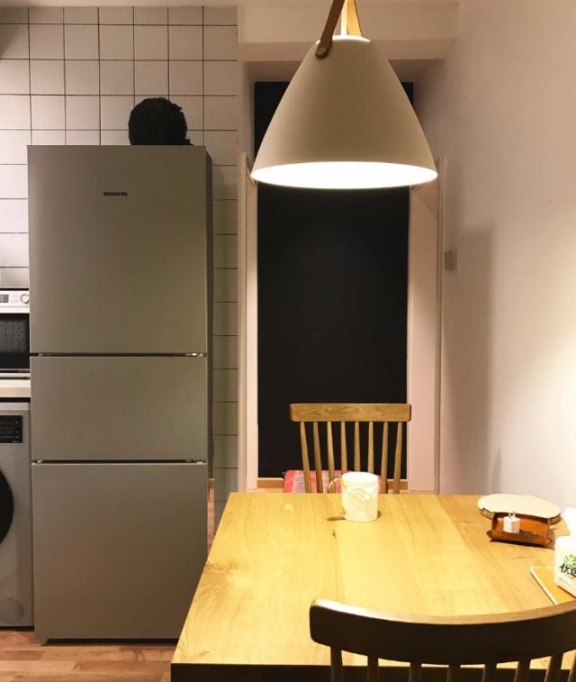 ▼廚房做成了開放式的,將洗衣機和冰箱放置在這裡,比放在門口更節省空間。餐廚空間和內部的臥室、客廳用深色的簾子隔開,做料理的時候可以屏蔽油煙。
