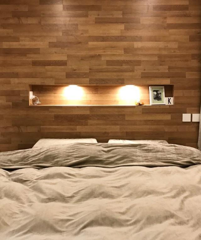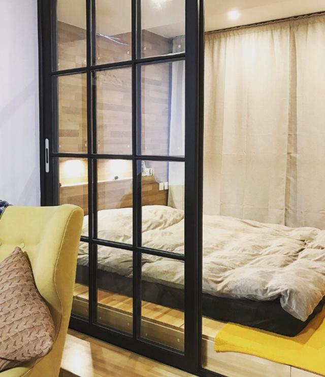 ▼小臥室和客廳之間有一道推拉門,不會影響客廳的採光。床頭背景牆使用的是木紋材質,看起來溫馨舒適。再鋪設一張軟床墊就可以了。
