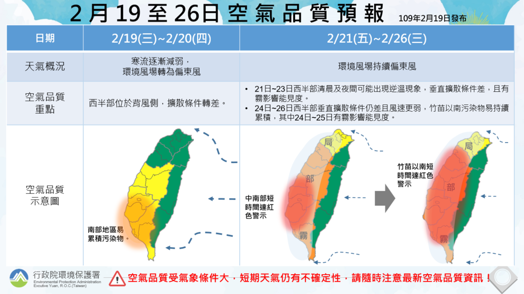▼根據環保署空氣品質預報:24日西半部位於背風側,中南部地區位於弱風區,擴散不易,空氣中易累積髒污。另西半部地區及金門馬祖清晨易有局部霧影影響能見度,駕駛者還請小心。宜花空品區為「良好」;北部、竹苗地區及金馬、澎湖地區為「普通」,桃竹苗沿海地區可能達「橘色提醒」等級;中部、雲嘉南和高高屏地區為「橘色提醒」,南部局部地區短時間達「紅色警戒」。