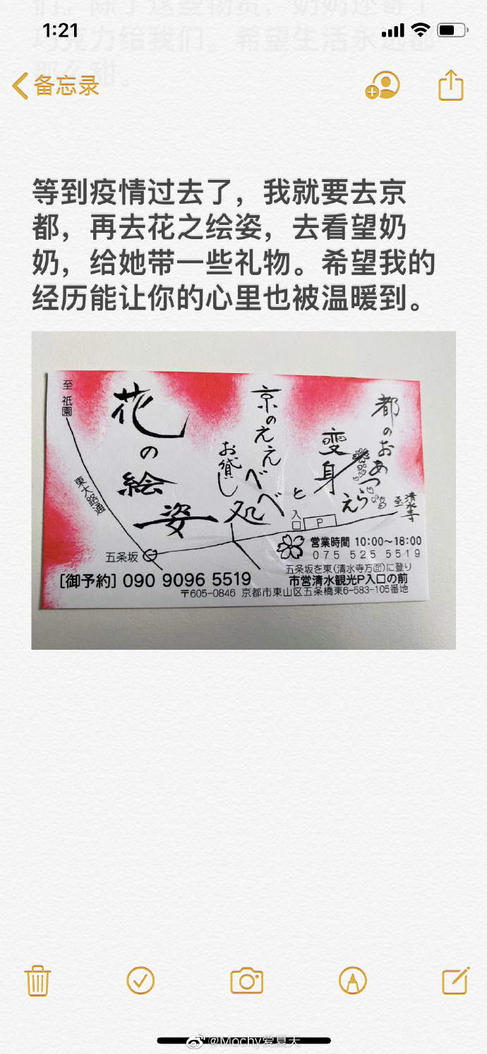 ▼後來這名女孩跟那名婆婆通電話,婆婆一直問她是否「元氣」,還用中文跟她說「非常感謝」,這讓她更加感動。她特別po出穿著婆婆店裡的和服拍的照片,表示疫情過去後會和朋友再去拜訪。
