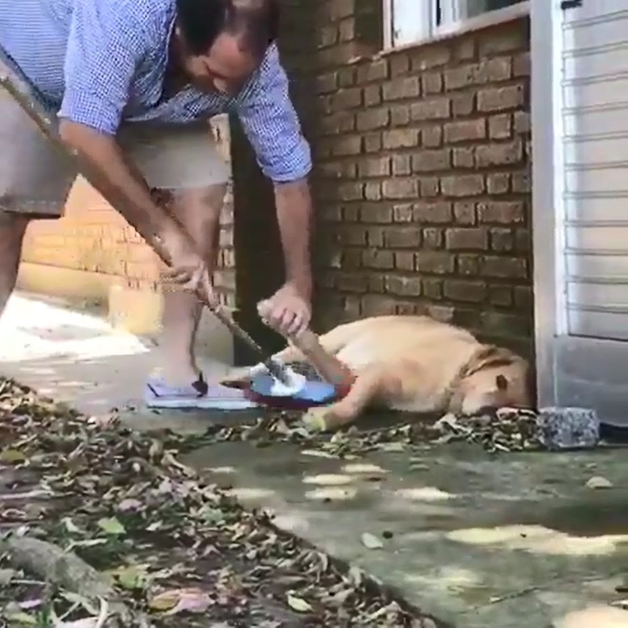 借過一下好ㄇ?懶汪躺地不想動 主人無奈「提腳腳掃地」