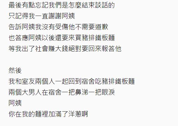 ▼直到有一天老闆娘說出真相:「看到你拿著坑坑窪窪的水壺,穿著開口笑的布鞋,背著很舊的書包就知道你不容易。真的很想幫助你,千萬不要因此不來買豬排麵。」