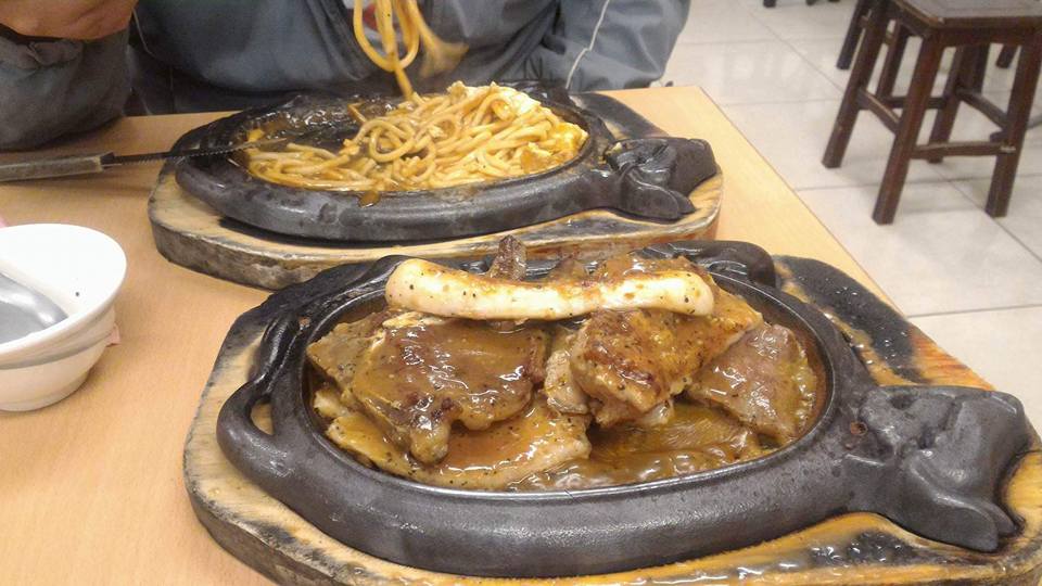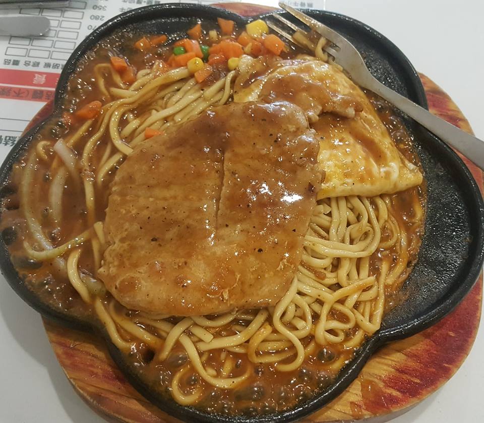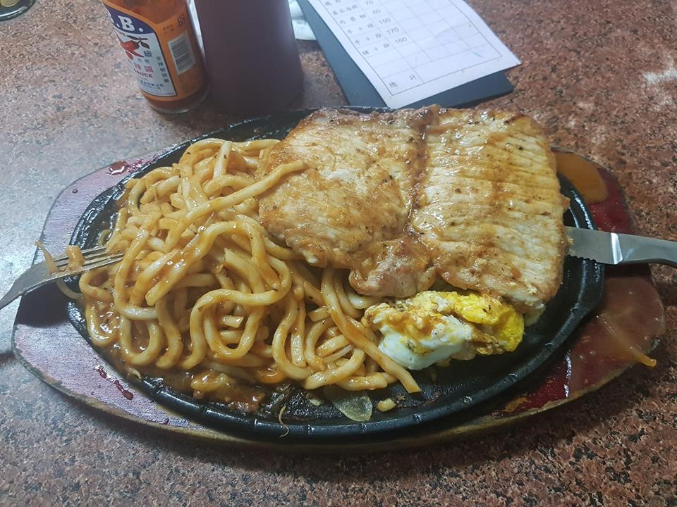 ▼為了不讓舍友們擔心,他常常躲到外面吃吐司。一次偶然的機會他發現一家老舊的牛排店,看到招牌上的「50元豬排鐵板麵」價格公道就點了一份。這份豬排面不僅份量超足還附贈湯和飲料,裡面的豬排比面還大,足足抵上兩份的量。