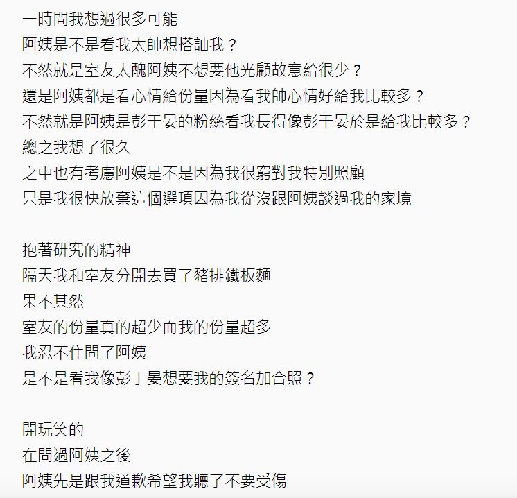 ▼隨後原po把這家店分享給了舍友,舍友卻氣沖沖的告訴他豬排鐵板麵的豬排很小還沒有附贈湯和飲料。原po也猜想是不是老闆娘看他窮特意幫助他,但自己並沒有透露自己的處境。